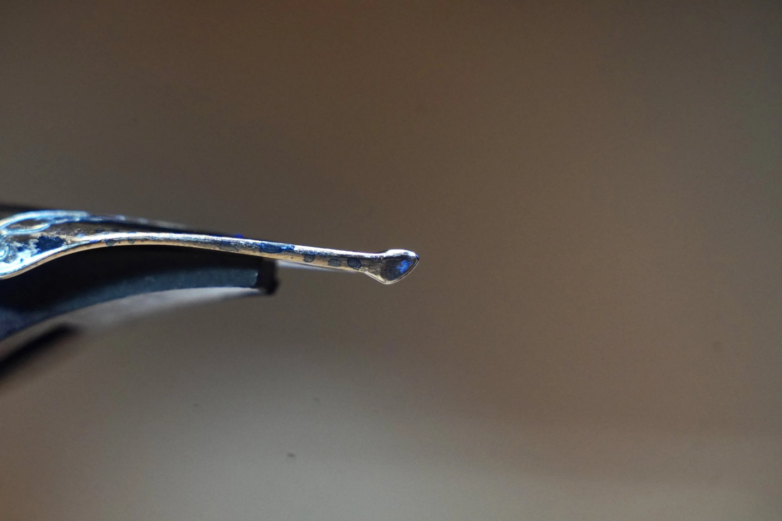 At Kyuseido, we grind the nib with a roughly 45-60 degree slant, curving the writing plane of the nib so that variation in nib angle still results in pleasant writing for the user. Similar to our Naginata-Togi nib, higher writing angles will yield a thinner line, whereas lower angles will provide maximum variation. Once the writing plane has been cut, we bring in the sides of the nib to shape the tipping to be as sharp as possible at the tip. Note that while every grinding studio will do things differently, we like to start grinding from the wing of the nib in order to maintain the aesthetic balance of the nib itself. This means that plated nibs will have the sides of the nib ground, thus showing the base material underneath. Once we have the sides of the nibs cut to the correct shape and proportion, we grind the top of the tipping to be flat. We also add a diagonal cut on both sides of the nib and tipping to complete the nib, which gives the nib what we consider the optimal flow of ink to tipping to paper.