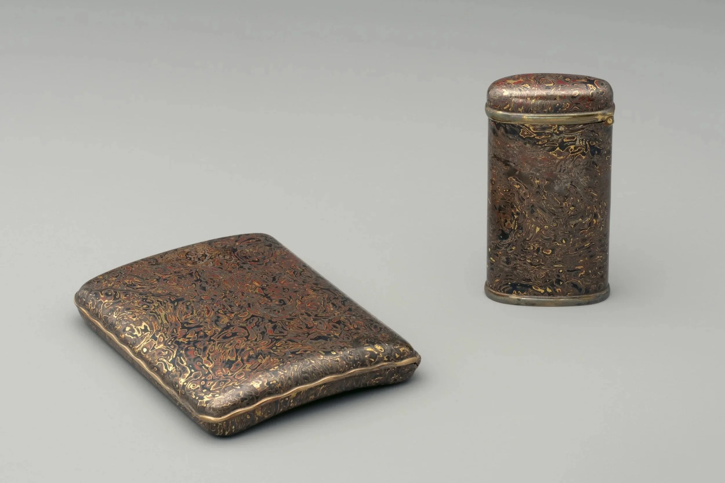 Left: Mokume-gane Inro, Right: Tiffany & Co. Mokume-gane Cigarette Case, The Metropolitan Museum of Art, New York.