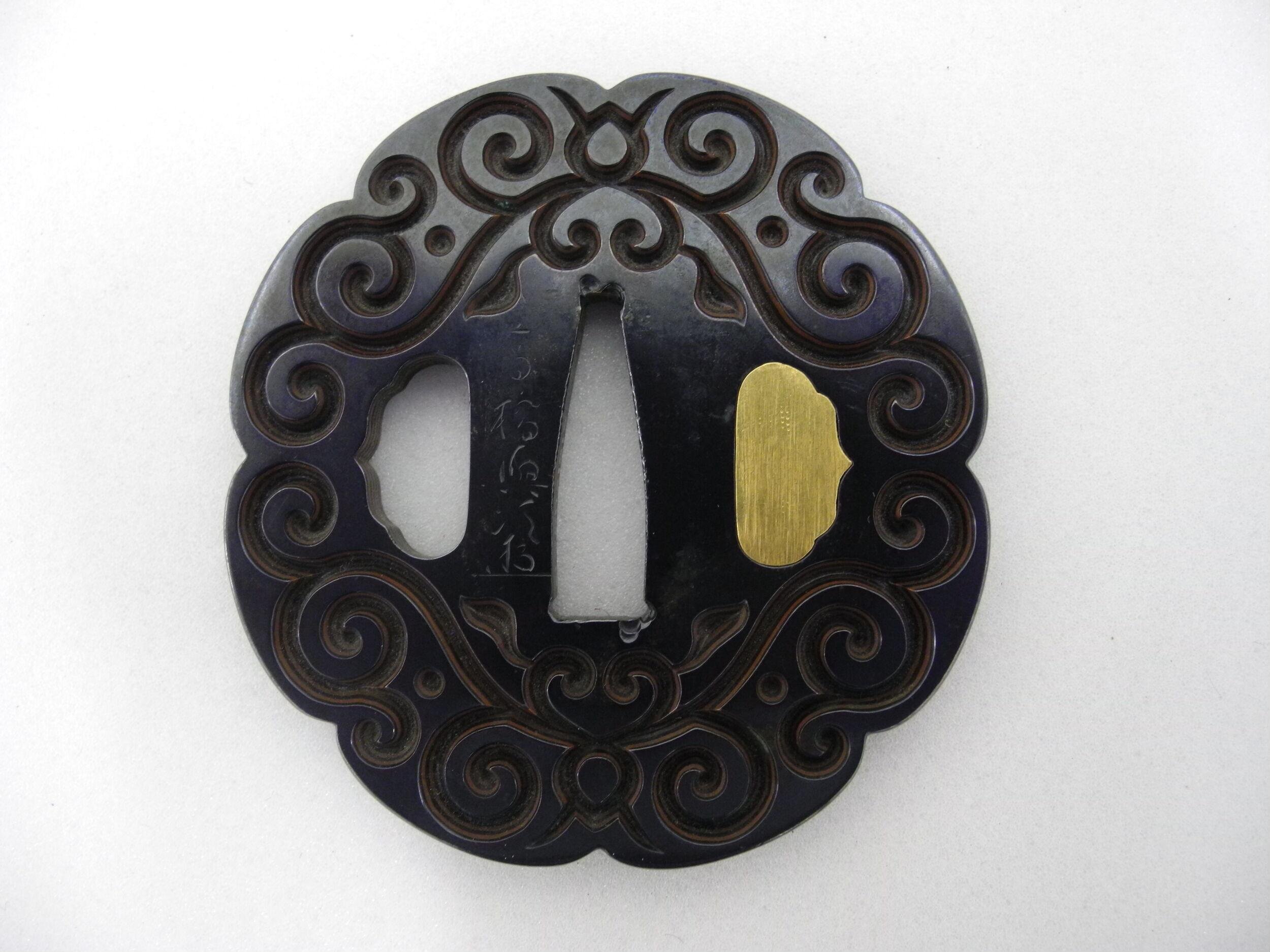 While Mokume-gane was passed down from Shoami Denbei to other craftsmen during the Edo period, the most notable craftsmen in this lineage were Takahashi Masatsugu who formed the Takahashi School, and his adopted son Takahashi Okitsugu who continued working with tsuba designs using Guri bori (ぐり彫り) and Mokume-gane techniques in the mid-Edo period (19th Century).