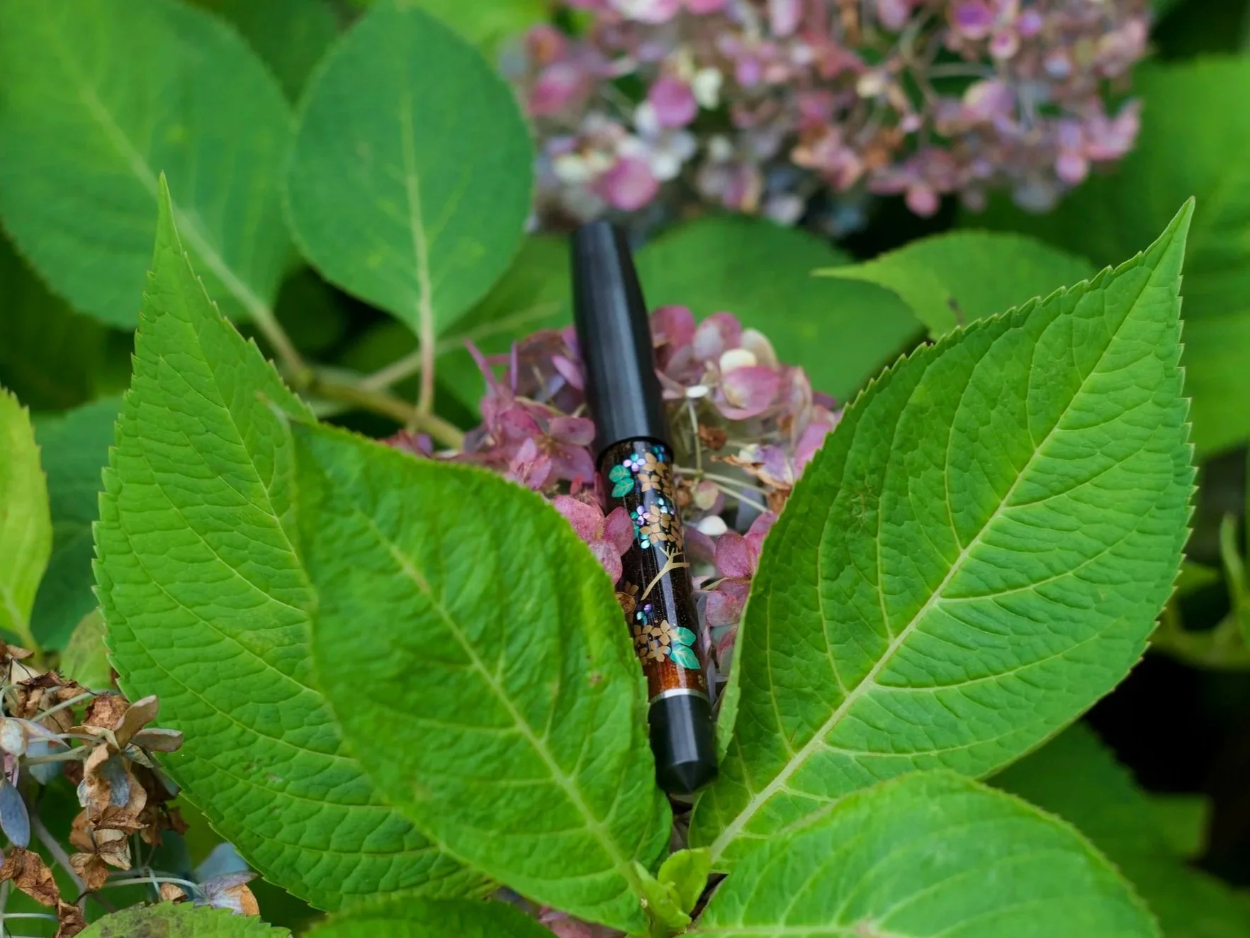 Hydrangeas are known for their color variations from their deep blues to vibrant pinks, which results from the acidic or alkaline conditions of the soil they grow in. Taking inspiration from this, we decided to use the natural iridescent properties of the abalone shell used for raden inlay to reflect the myriad colours that shift depending on the angle of light. This is paired with gold maki-e details to complete the Hydrangea blooms, adding a sense of depth to their characteristic spherical clusters.